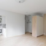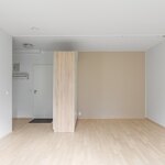 Vaatehuoneessa on laminaattilattia ja maalatut seinät.