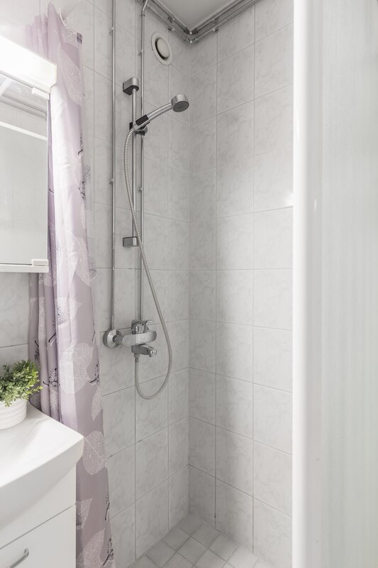 Klyphuoneen allas, allaskaappi ja hana on uusittu 2025. Pesukoneen paikka suihkuseinästä oikealle.