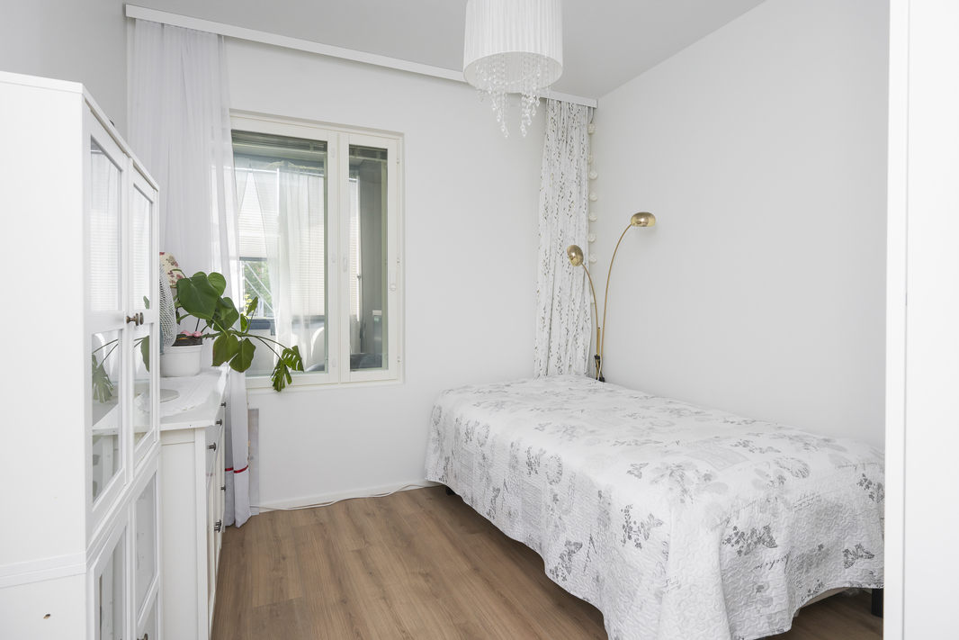 Makuuhuoneessa ja eteisaulassa on kaapistot, lisäksi huoneistokohtainen varastotila.