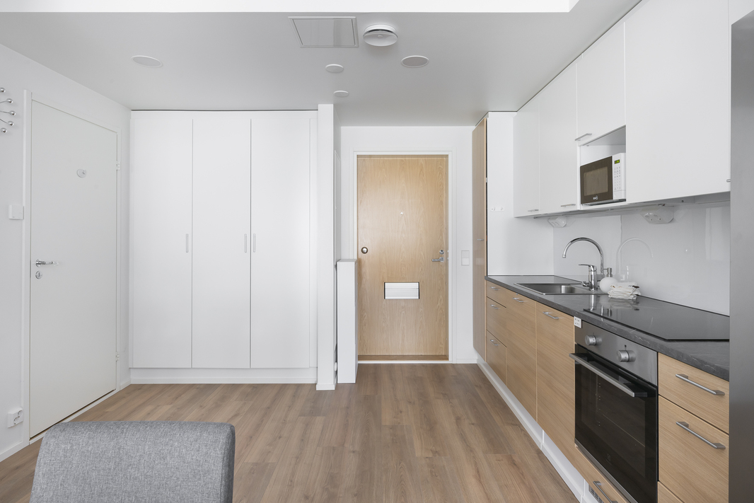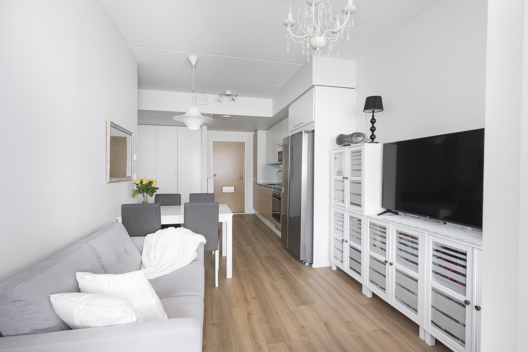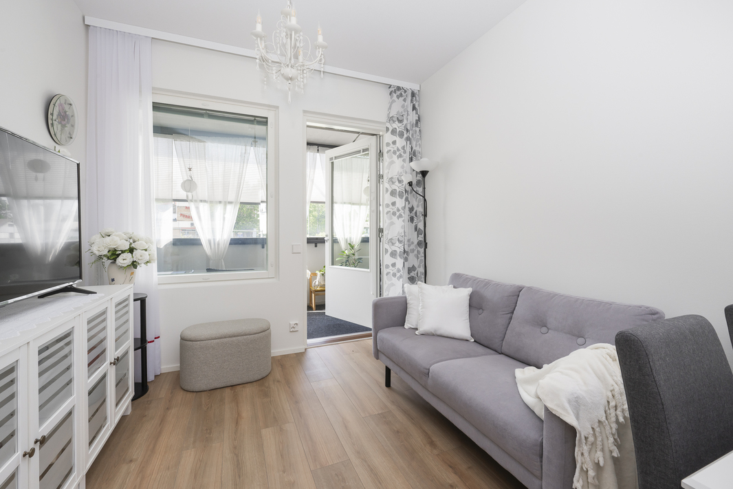 Avokeittiössä on integroitu astianpesukone, erillisuuni, induktiotaso, side-by-side jääkaappi-pakastin sekä paikka mikroaaltouunille kaapistossa. Makuuhuoneessa ja eteisessä kaapistot, lisää säilytystilaa on huoneistokohtaisessa varastotilassa (lämmin). Vaaleasävyinen kylpyhuone, jossa hyvin tilaa pyykinpesukoneelle. Oma sauna. Olohuoneesta on käynti lasitetulle parvekkeelle, joka avautuu lounaaseen. Parveke toimii lisätilana aikaisesta keväästä pitkälle syksyyn, neliöitä parvekkeella on n. 9. Parvekekaihtimet lisäävät tilan monikäyttöisyyttä ja antavat näkösuojaa. Modernit pinnat ja nykyaikaiset ratkaisut takaavat helppohoitoisuuden ja miellyttävän asumiskokemuksen.