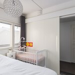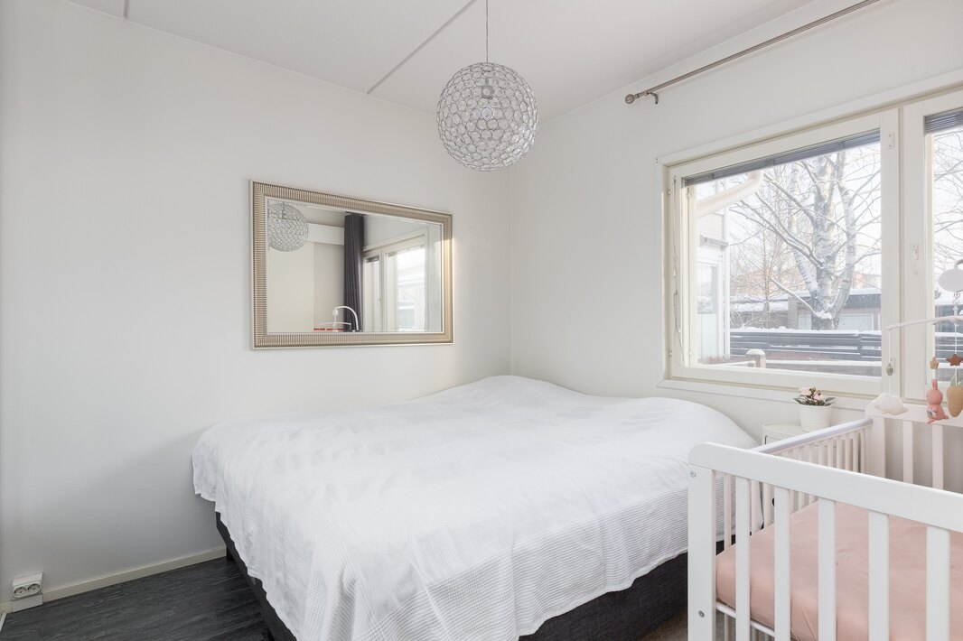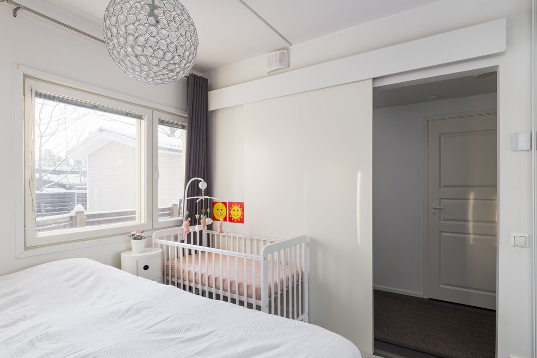 | Makuuhuoneen kuvaus | Makuuhuoneessa peililiukuovikaapistot. Makuuhuoneen ja eteisen välissä neliöitä säästävä liukuovi. |