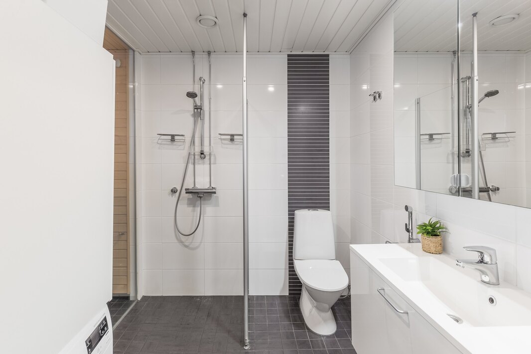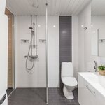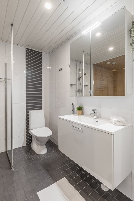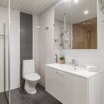 Kylpyhuone ja sauna muodostavat kauniin ja käytännöllisen kokonaisuuden, jossa saunan ja pesutilan välinen lasiseinä tuo tilaan avaruutta sekä modernia ilmettä. Pyykinpesukoneelle löytyy paikka ja tarvittaessa myös pesutorni on asennettavissa (pyykkikaapin voi poistaa). Eteisessä ja makuuhuoneessa on peililiukuovikaapistot, ja lisäksi käytössä on huoneistokohtainen lämmin varastotila. Lattiamateriaalit ovat helppohoitoiset: eteisessä laatta ja asuinhuoneissa laminaatti. Asuinhuoneiden seinät on maalattu.