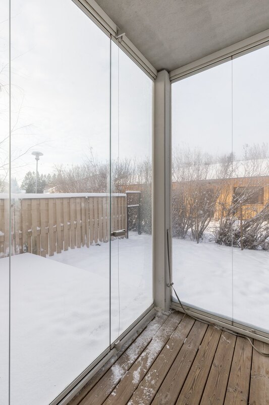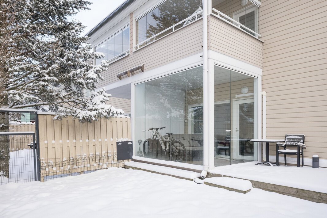 Päätyasunto, jossa on aidattu takapiha ja lasitettu terassi. Terassi kutsuu istumaan alas aamukahvin kanssa tai nauttimaan illan hämystä yksin tai ystävien seurassa. Pieni piha mahdollistaa citypuutarhan pidon tai vaikkapa riippumatossa loikoilun.