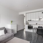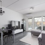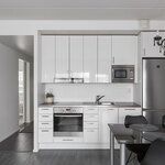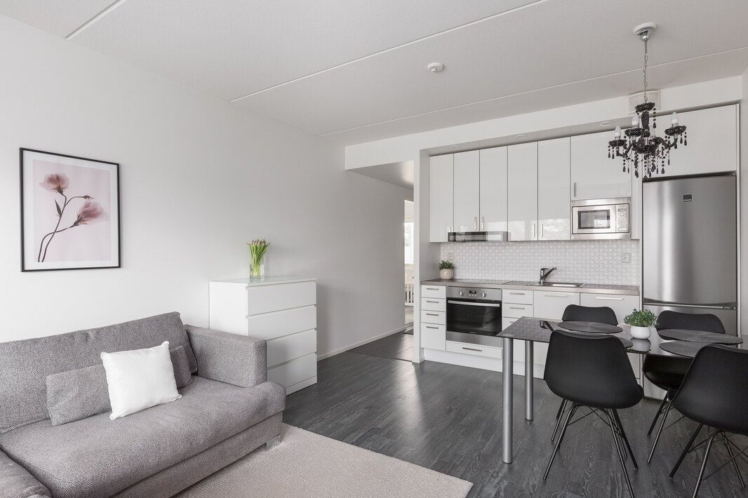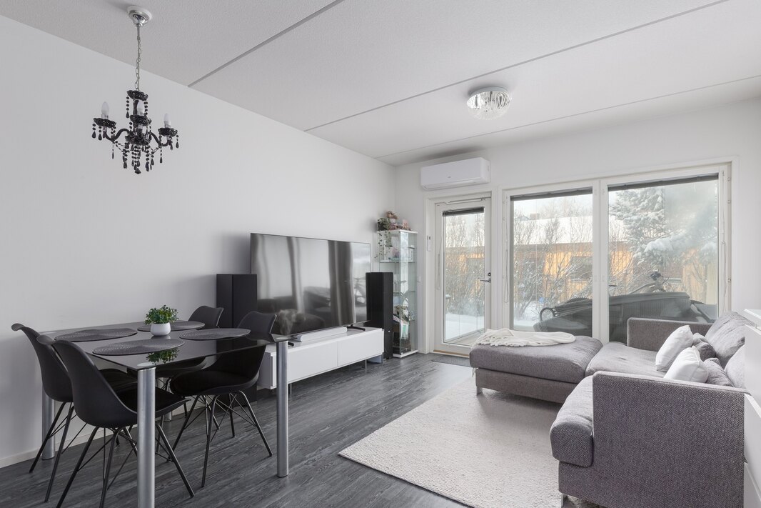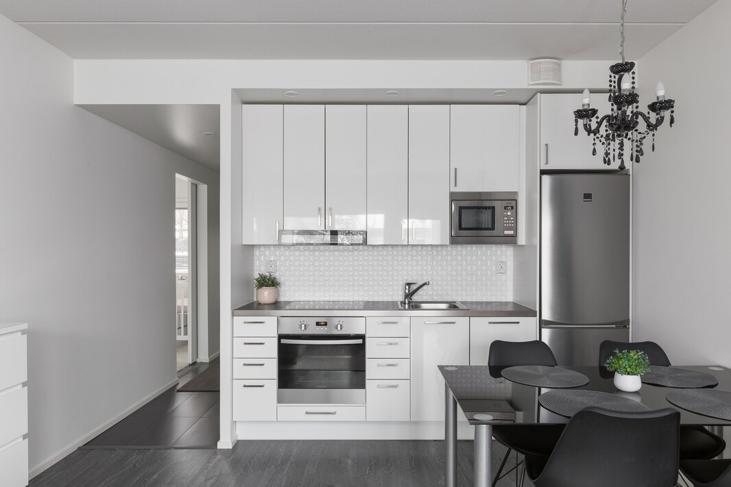 Asunnon tunnelma on rauhallinen ja lämmin. Avokeittiö ja olohuone muodostavat yhtenäisen tilan, ilmalämpöpumppu tuo tarvittaessa viilennystä lämpöisinä kesäpäivinä. Avokeittiön integroidut kodinkoneet pitävät kokonaisuuden selkeänä ja huoliteltuna. Keraaminen liesi ja kiertoilmauuni, jossa myös grillitoiminto.