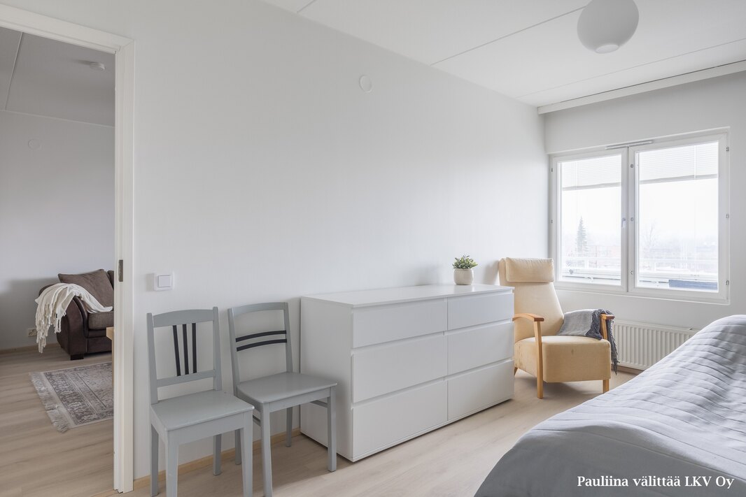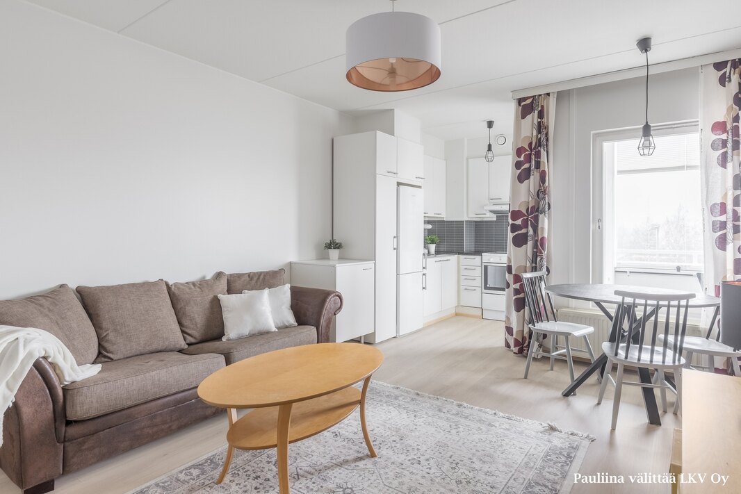 Eteiseen astuessa luonnonvalo tervehtii sinua olohuoneen ikkunasta ja liukuovikaapistojen taakse järjestyvät suloisessa sovussa kengät, takit, siivoustarvikkeet ja muut säilytystä kaipaavat tavarat. Eteisen vieressä on v. 2010 remontoitu kylpyhuone, jossa paikka pesukoneelle, pyykkikaappi, pieni seinäkaappi sekä pyyhekuivain. Makuuhuoneessa on tilaa niin parisängylle kuin työpisteelle tai vaikkapa kuntopyörälle. Säilytystilaa on makuuhuoneen yhteydessä olevassa vaatehuoneessa ja huoneistokohtaisessa varastossa. Keittiönurkkauksen kaapistoissa on paikka mikroaaltouunille, jääkaappipakastin, induktioliesi sekä perinteinen astiankuivauskaappi. Ilta-auringon suuntaan avautuvalla lasitetulla parvekkeella on Vizorin säädettävät kaihtimet, jotka tuovat asumiseen mukavuutta. Kaiken kaikkiaan tämä on arjessa toimiva ja muuttovalmis koti.