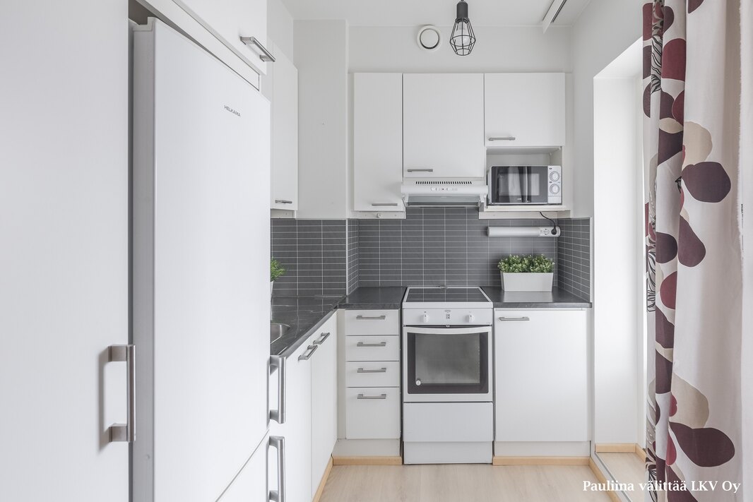 | Keittiön varustelu | Kaapistossa paikka mikroaaltouunille. |