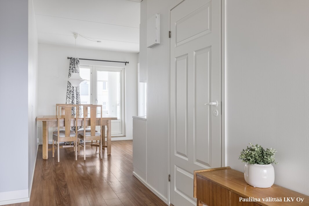 Eteiseen astuessa makuuhuone on heti vasemmalla, eteiskäytävän päässä kylpyhuone ja päädystä tila avautuu oikealle olohuoneen ja vasemmalle keittiön suuntaan. Kylpyhuone on remontoitu v. 2010/2011, päivitetty v. 2016: ovi, lavuaari ja allaskaappi uusittu sekä asennettu taittuvat suihkuseinät. Keittiön ovet ja tasot on uusittu v. 2016, kaapistoissa ja laatikostossa softclose-toiminto. Keittiöstä on käynti lasitetulle parvekkeelle, jossa asumismukavuutta tuovat Vizorin säädettävät parvekekaihtimet. Valoisan olohuoneen ikkunat avautuu ilta-auringon suuntaan. Makuuhuoneen ja keittiön ikkunat aamuauringon suuntaan, itään. Makuuhuoneessa ja eteisessä säilytyskaapistot, huoneistokohtainen irtaimistovarasto vintillä. Tämä viihtyisä ja hyvin pidetty koti vapautuu tarvittaessa nopeastikin.