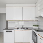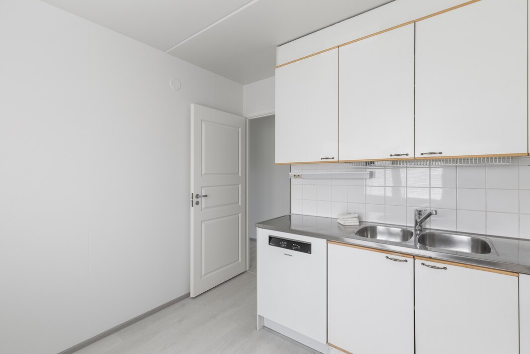 Keittiössä tilaa ruokapöydälle, astianpesukone, jääkaappipakastin.