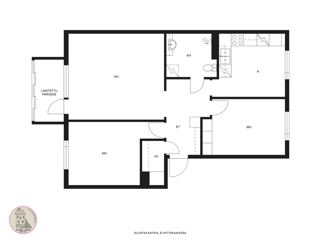 | Huoneistoselitelmä | 3h, k, lasitettu parveke |