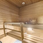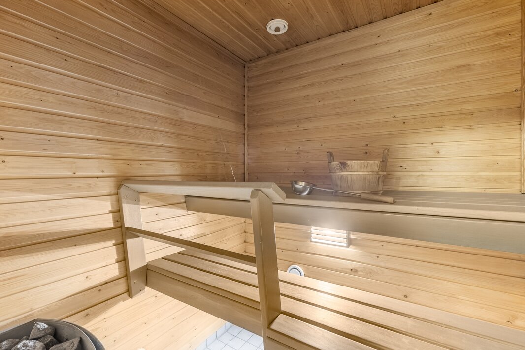 Tunnelmalliset pariovet johdattavat olohuoneeseen, johon mahtuu sohvaryhmän lisäksi esim. työpiste tai isompi ruokailupöytä. Kaksi makuuhuonetta, joista isommassa kaapistot. Tilava keittiö, jossa on tilaa myös kokkailla yhdessä. Erillinen wc ja kylpyhuone & sauna on vierekkäin.