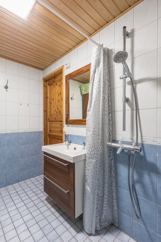 Edessä oikealla ovi erilliseen wc:n ja vasemmalla kylpyhuoneeseen/saunaan.