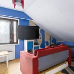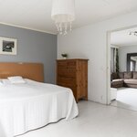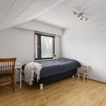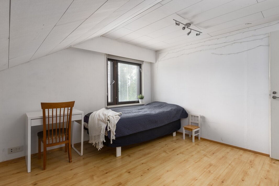 Ensimmäinen yläkerran makuuhuoneista jatkuu lappeen alle.