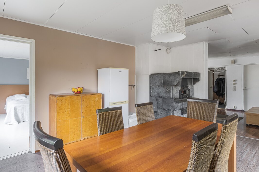 Keittiöön mahtuu iso ruokapöytä, joten yhteiset kokkailu- ja ruokailuhetket voi toteuttaa isommallakin porukalla. Keittiön vuolukivinen leivinuuni ja olohuoneen varaava takka luovat kodikasta tunnelmaa. Makuuhuoneista kolme on yläkerrassa ja yksi alakerrassa. Yläkerrassa myös wc ja parveke. Alakerran kylpyhuone ja sauna on remontoitu v. 2006. Kellarikerroksessa on vain pari pientä matalaa tilaa. Eteisen vieressä oleva varastotila eli ”remppahuone” oli suunnitelmissa muuttaa kodinhoitotilaksi, mutta uusi omistaja voi muokata siitä omiin tarkoituksiinsa sopivan tilan.