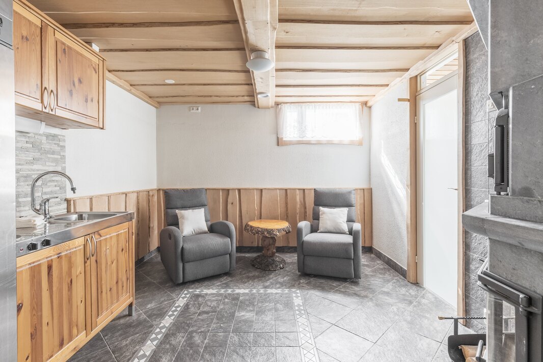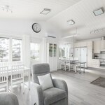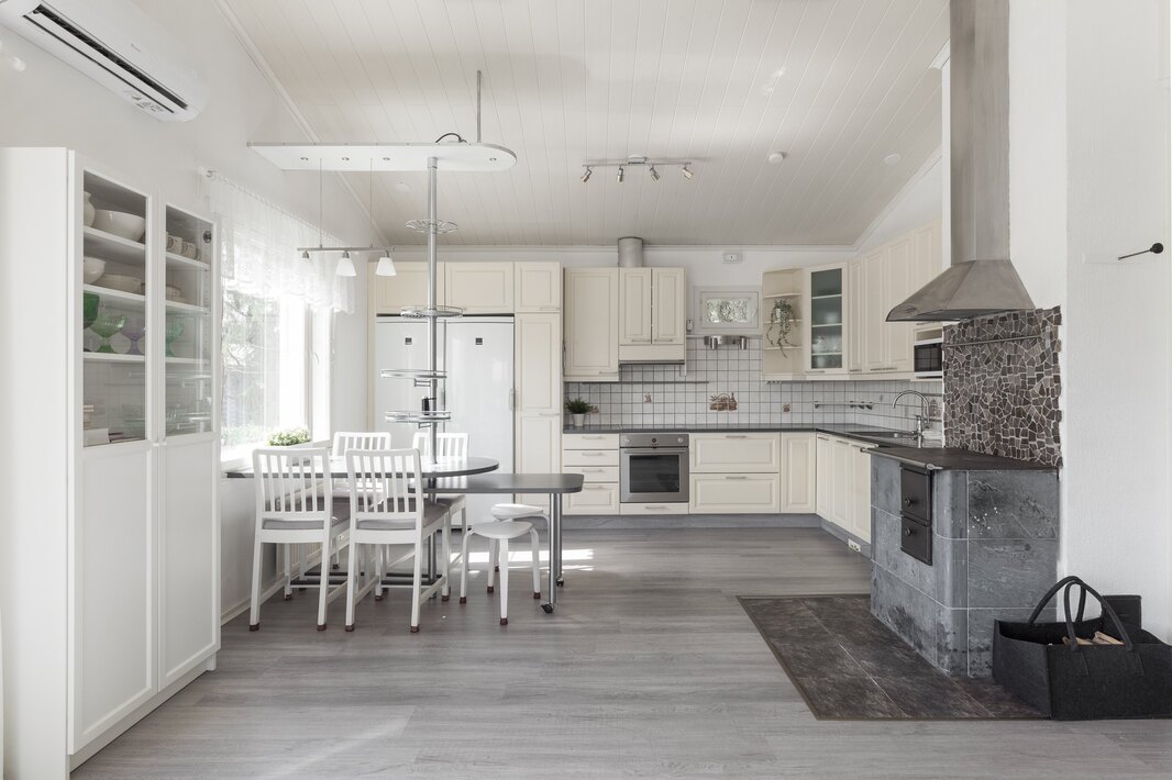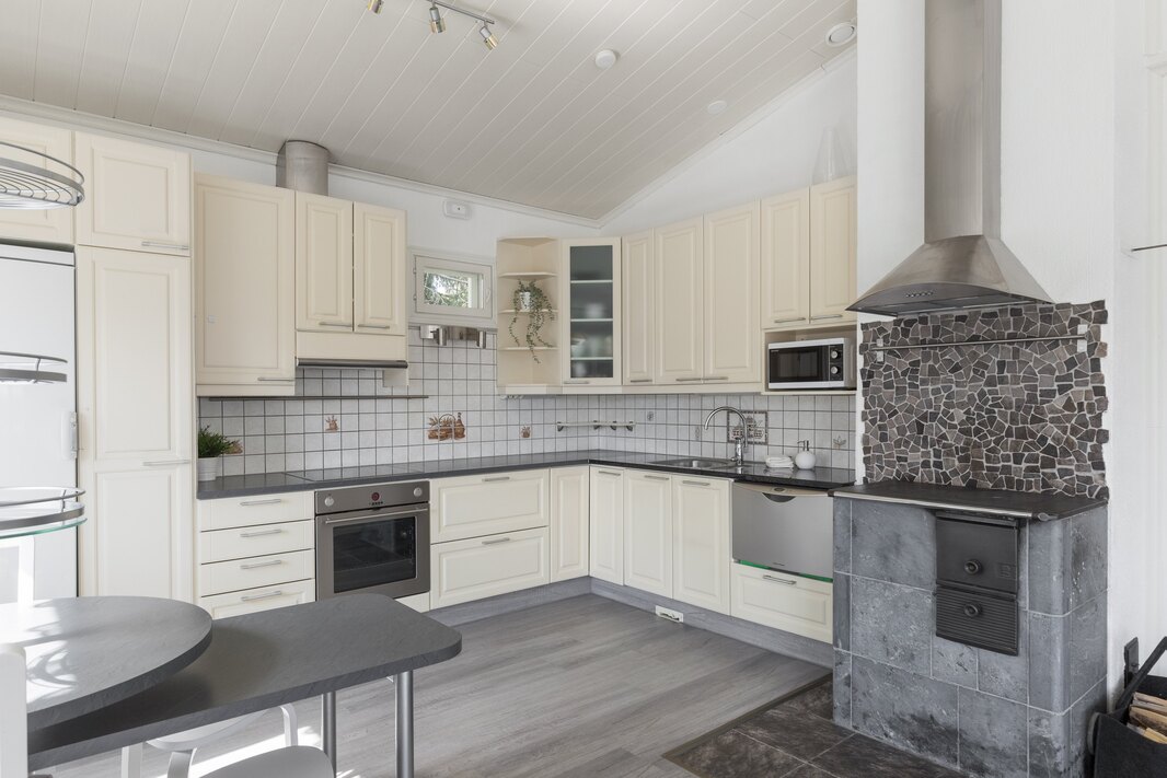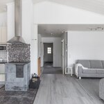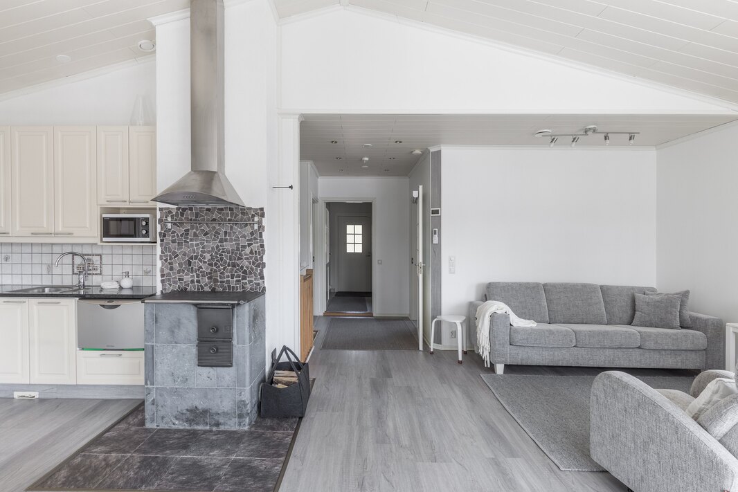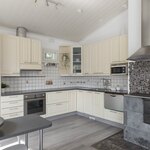 | Keittiön varustelu | Kaapistoissa soft close-toiminto. Korkeassa kaapissa vetolaatikostot. Keskuspölynimurin ns. rikkalapio kaapiston alaosassa. Kulmakaruselli. Vuolukivinen puuliesi, jonka ympärillä kivilaattalattia. Liesituuletin myös puulieden yläpuolella. |