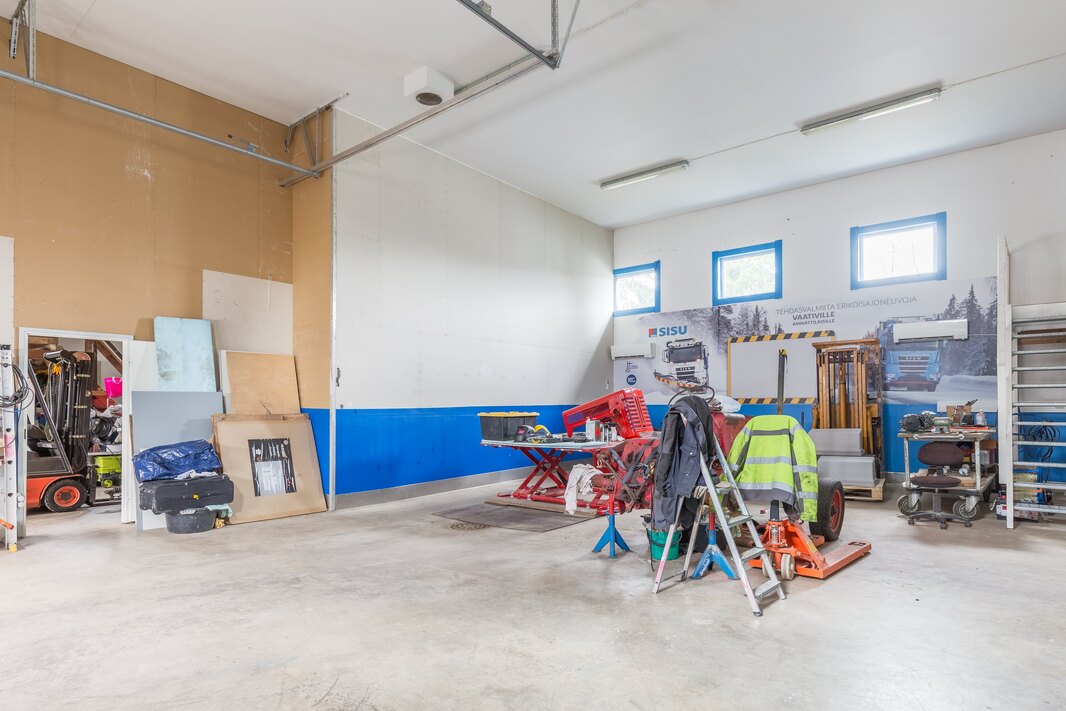 Hallirakennuksen kahdessa hallissa yhteensä 444 m2 jakautuen toimistotiloihin (76 m2) ja tuotantotiloihin (368 m2). C-pääty vuokrattu pitkäaikaiselle ja hyvälle vuokralaiselle.