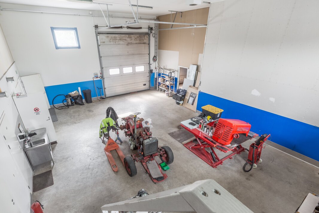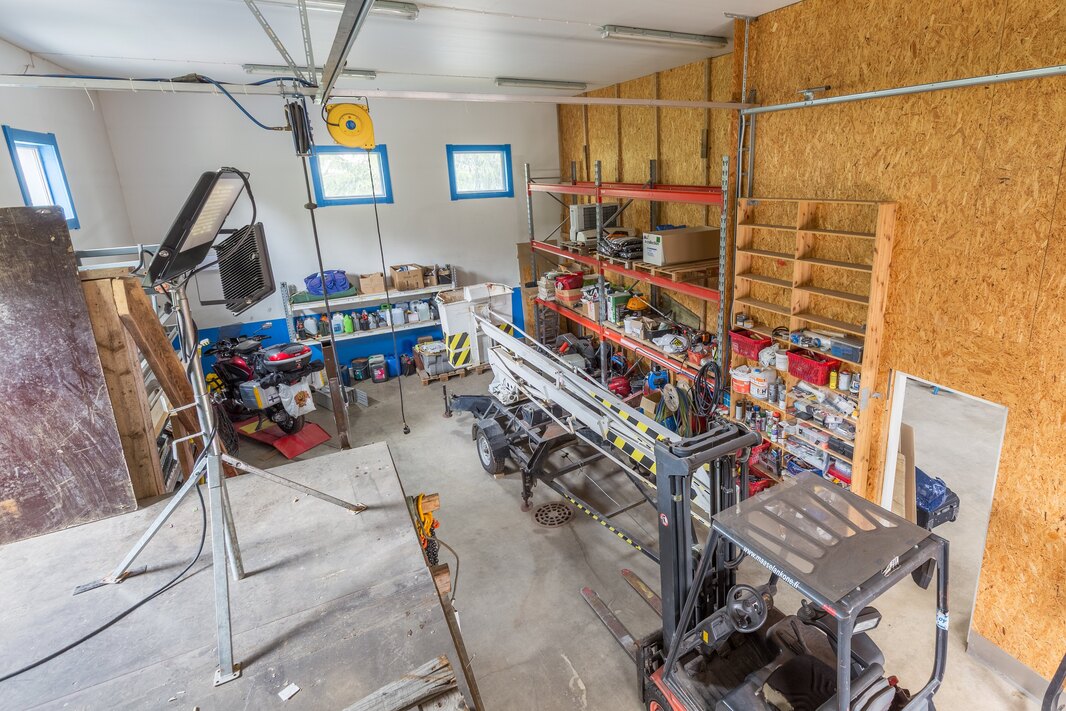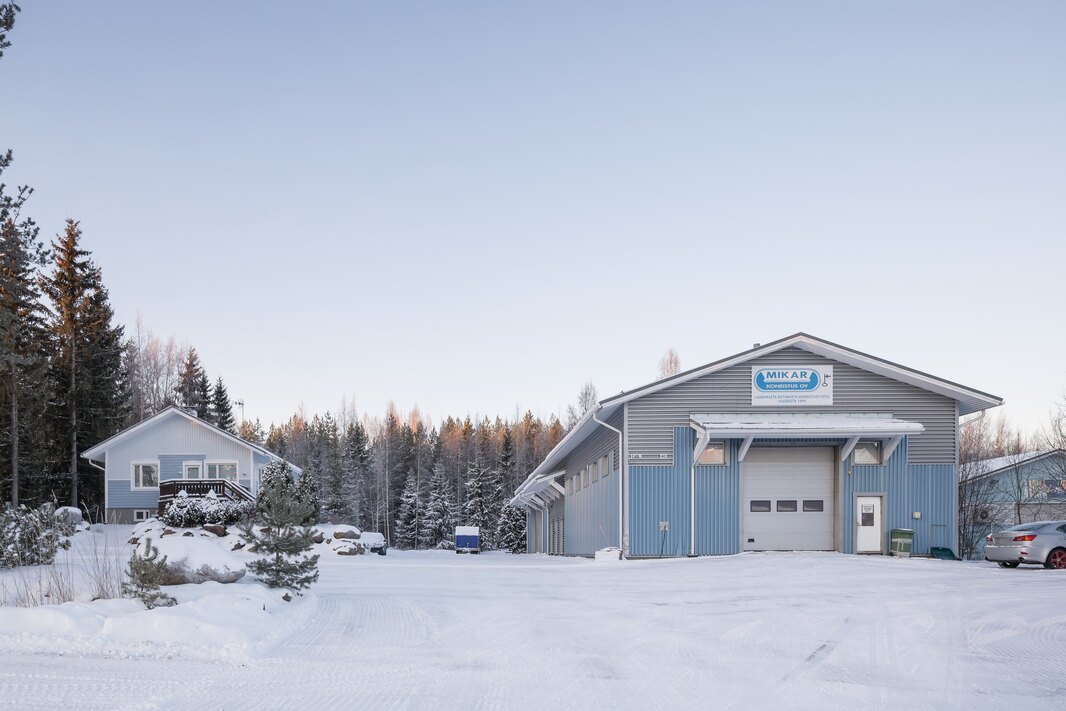 Hallirakennus ja omakotitalo samalla kiinteistöllä. Rakennuksista on pidetty hyvää huolta.